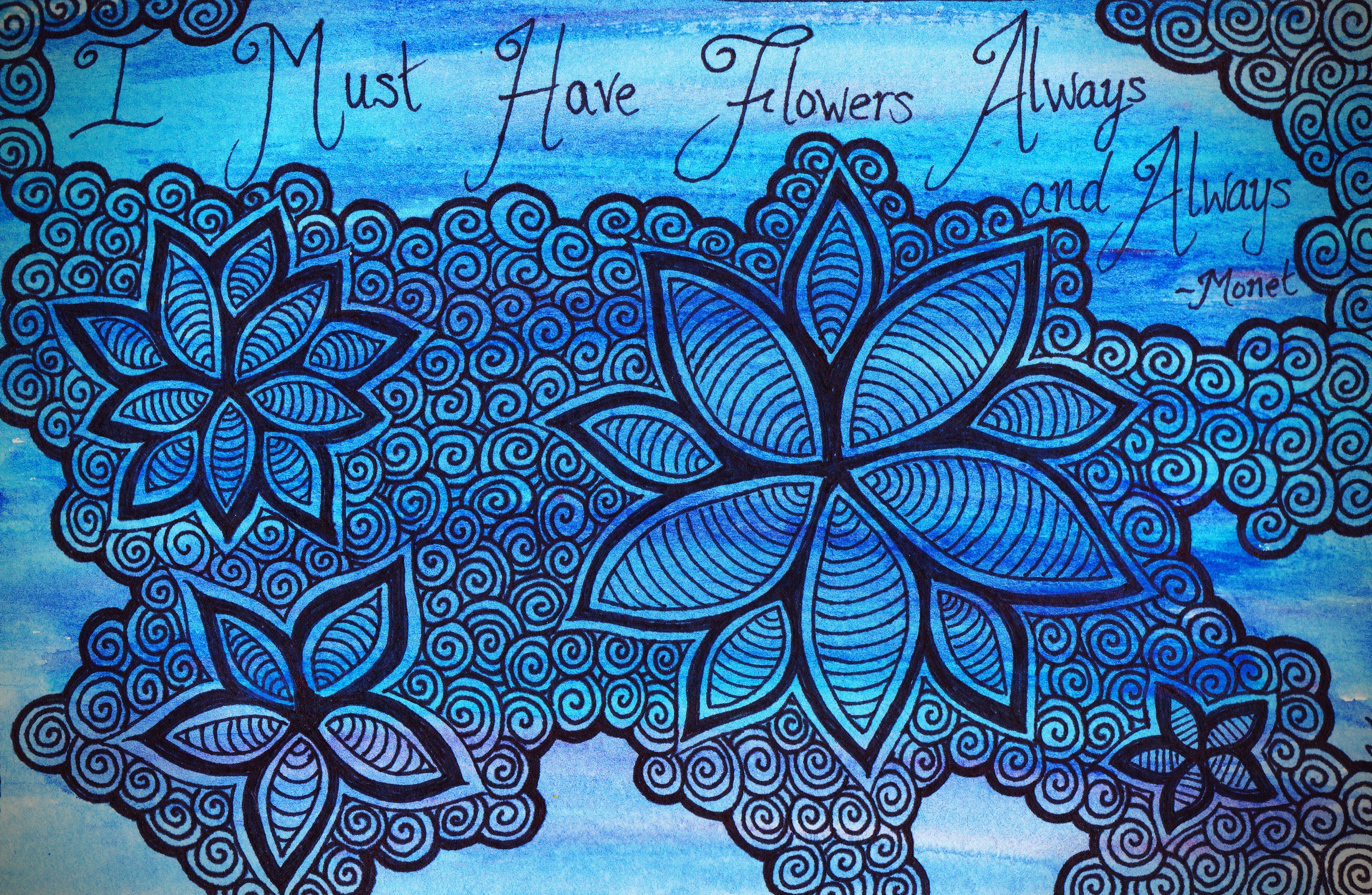 On my final attempt at creating something with Monet’s words, I chose a paper I’d pre-painted with watercolor. It was dark blue, streaked and a bit uninspiring. I wrote the words with my faithful sharpie marker, trying to take my time (maybe that’s why my handwriting stinks? I’m always in a rush!).