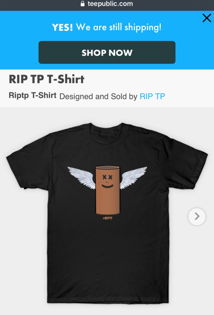 In honor of my odd adventure of bringing humor to the world via mourning the toilet paper shortage, here’s my store. There are shirts, hoodies, mugs, magnets, stickers, masks…quite a few options. I’m not in it to get rich, just hoping to see this absurd idea bring joy to the most random corners of this world.